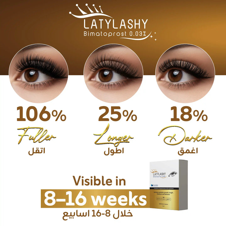 Latlylashy is an FDA-approved lash solution formulated with Bimatoprost 0.03% to effectively treat hypotrichosis (insufficient eyelashes), resulting in visibly longer, fuller, and darker lashes. Clinically proven to enhance eyelash growth by prolonging the anagen (growth) phase, Latlylashy doubles lash volume, thickness, and definition within 8 weeks of nightly use.