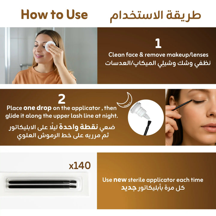 Apply one drop nightly to the upper eyelid margin at the base of the lashes using the provided sterile applicator. Do not apply to lower lashes. Replace applicator after each use. Remove makeup and contact lenses before application.
